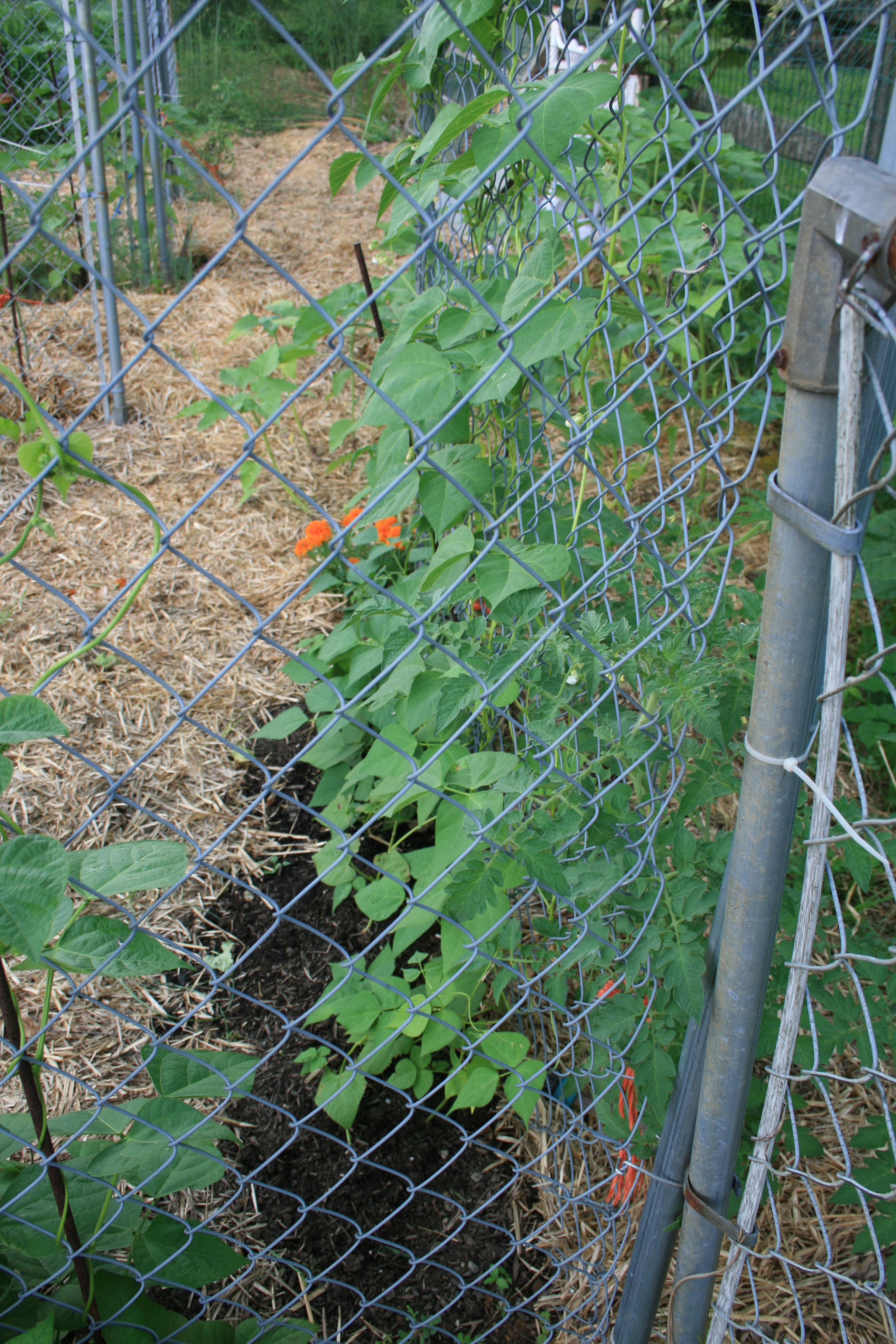 Pole beans, already over the top of the 8 foot fence are heading back down.