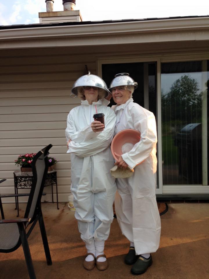 And to make you smile, I am sharing a picture of my sister Meg, now known as Commander Colander Head, and I heading out to the blueberry patch to do battle with the vicious and varied invaders we call hornets.