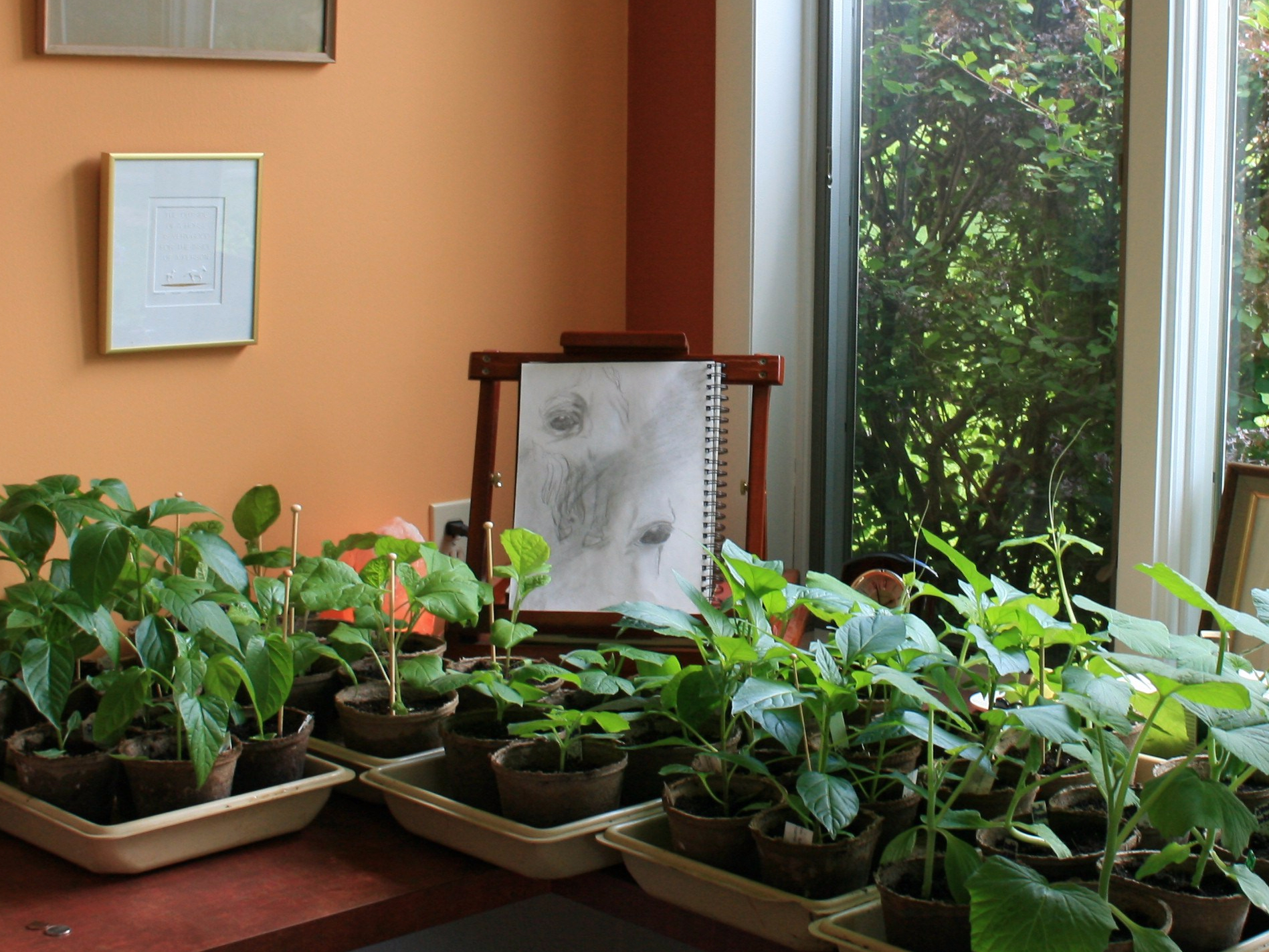 Cold, windy weather kept the bees inside the hive and this gardener indoors with trays of plants crowding the top of her desk and claiming space on the floor.