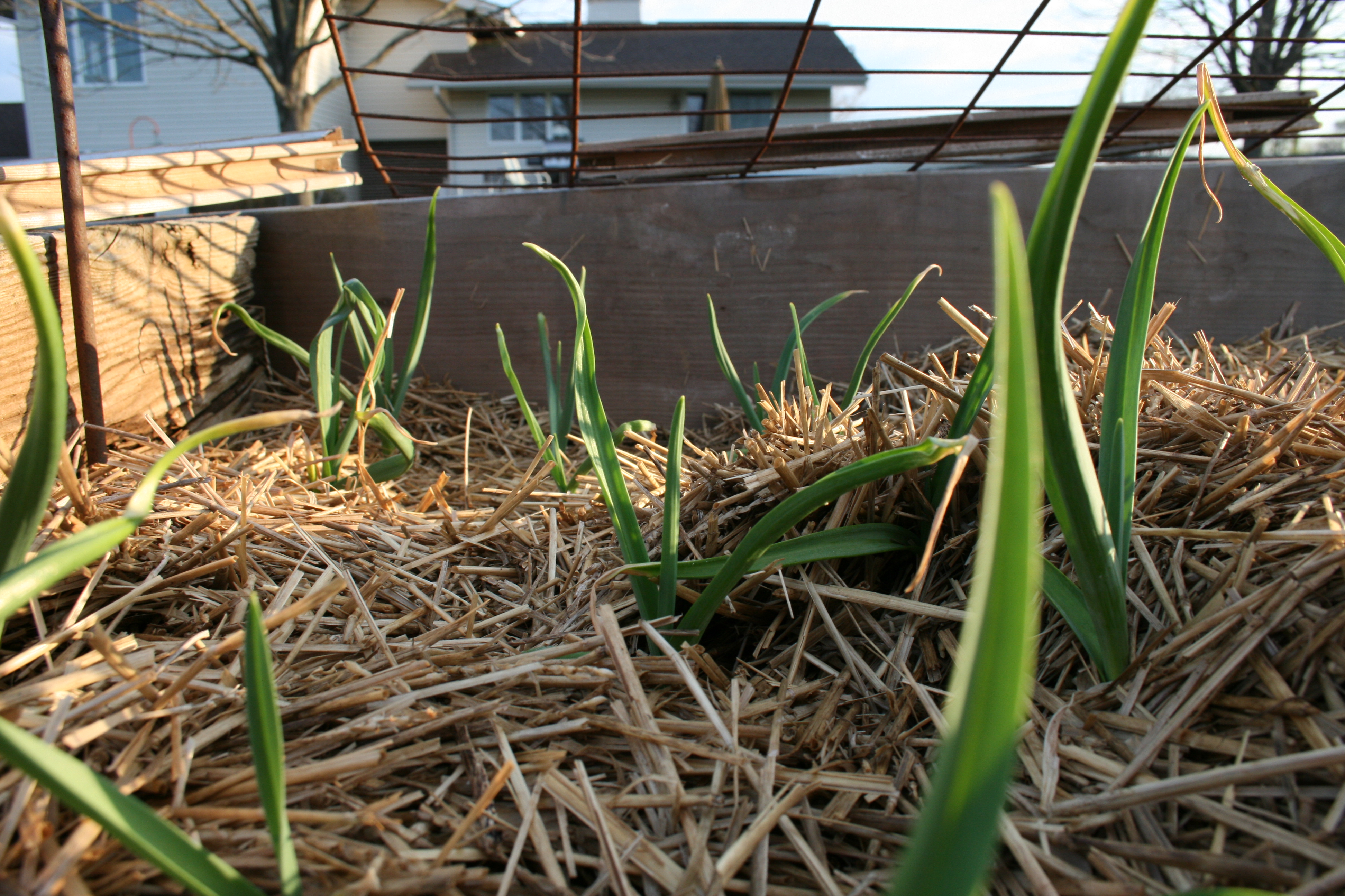 Depending on your zone, you will probably get a few frosts after you uncover the garlic. Just toss something over the young plants to protect them. I use window frames that I’ve stapled old curtains to or an old queen-sized mattress cover and drape it over the corners of the bed where the garlic is planted.